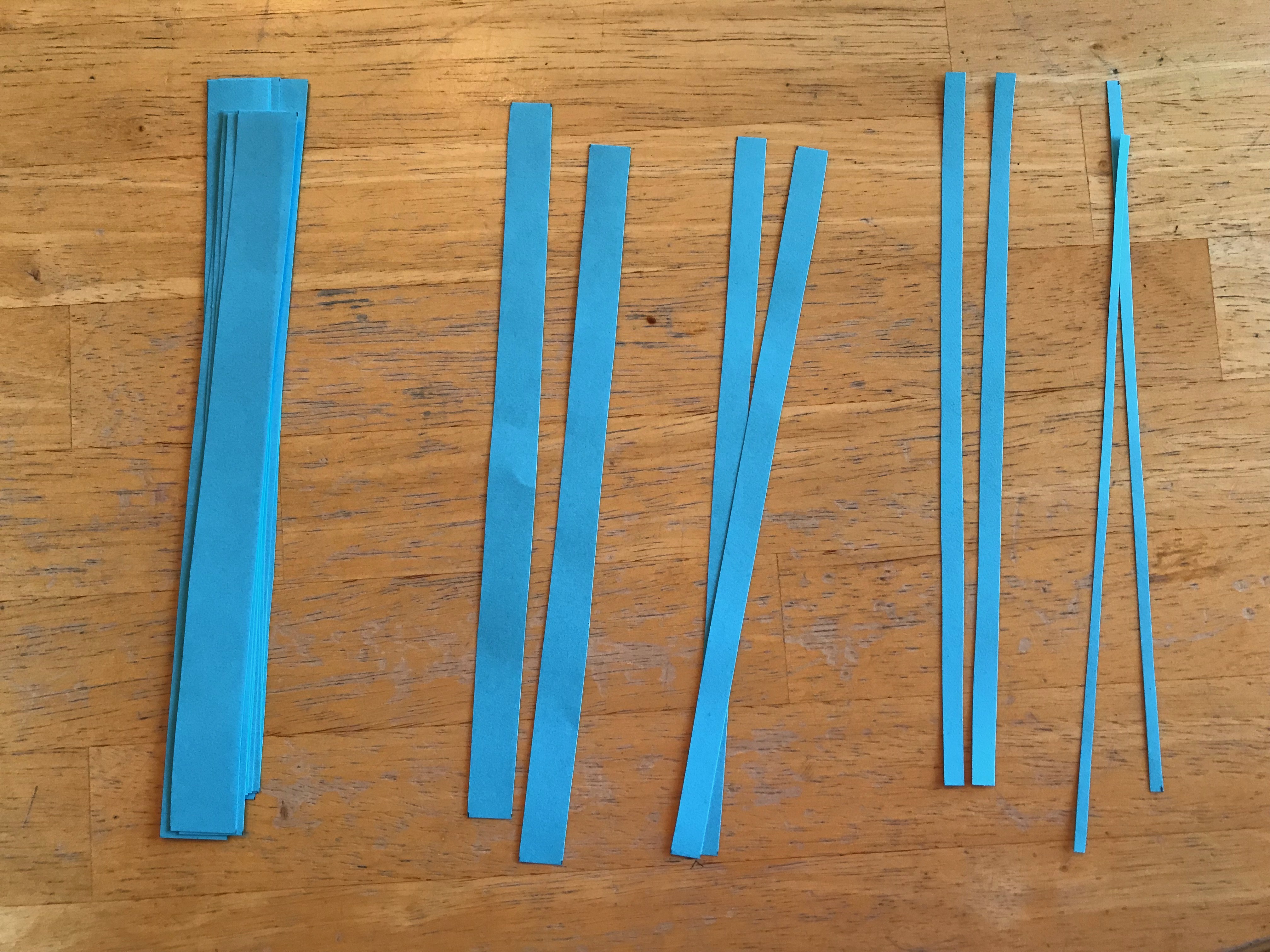 - Use your scissors to cut your colored sheet of paper into strips and separate them by size. (1/8 in, 1/4 in, 1/2 in, 3/4 in, and 1 inch).